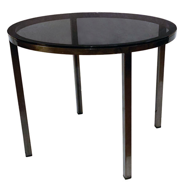 3 mesas realizadas en cristal gris y tubo de acero barnizado gris oscuro brillo.